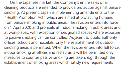 Tupakointitilojen markkinat eivät välttämättä myöskään ole aivan yhtä kuolevat kuin pohjoismaisesta vinkkelistä voisi luulla ja vaikka olisivatkin, yrityksellä alkaa olla muutakin liikevaihtoa + tosiaan lähes puolet on jatkuvaa laskutusta vuosien sopimuksilla. Ei se ainakaan yhden tai kahden kvartaalin aikana romahda. Päinvastoin kehitys on viime vuosina ollut nousujohteista.