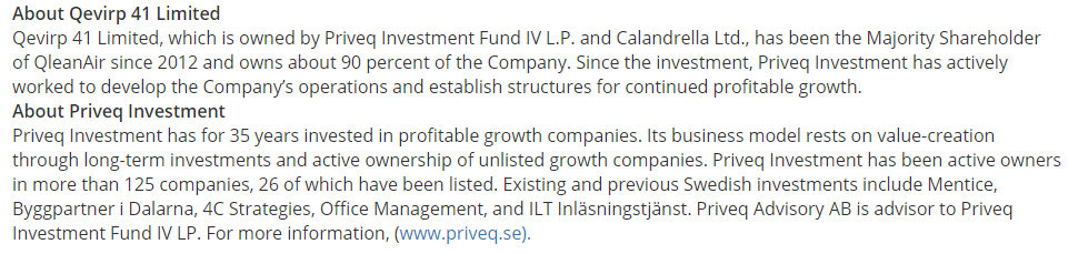 Qevirp 41 Ltd jäi edelleen suureksi omistajaksi (40,7%). Näköjään ovat listanneet aikasemmikin yhtiöitä. Ruotsalaisista yhtiön listaamista yhtiöistä ByggPartner i Dalarna ainakin ollut viime vuosina kurssiraketti. Qevirp on tuplannut QleaninAirin liikevaihdon ennen listaamista ja lähtenyt kehittämään Clean air as a service liiketoimintamallia. Tässä vielä suurimasta myyjästä/nykyisestä omistajasta: