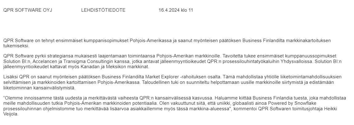 Regarding that Business Finland funding, the following was also mentioned in the Q4 report: “Additionally, on January 30, 2024, Business Finland approved QPR Software Plc’s Market Explorer funding, which is used to explore business opportunities and map markets in North America. The granted support covers 50% of the incurred costs, with a maximum limit of 39,995 euros. This financial support is intended to facilitate the company’s mapping of new markets and promote the conditions for the internationalization of the business.”