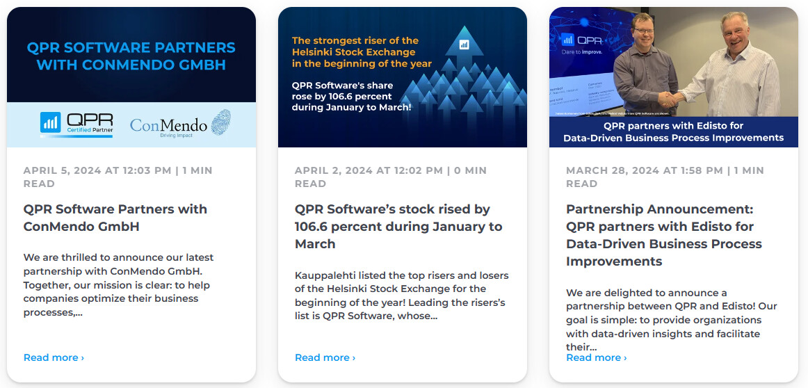 Solution BI was already mentioned in the Q4 report, but the other two are completely new names: “In accordance with its strategy, QPR aims to expand into the North American market, utilizing a partner network to be built there. An important step in this endeavor is the signing of a significant partnership agreement with Solution BI on January 16, 2024. The agreement includes resale rights for QPR ProcessAnalyzer in the United States, Canada, and Mexico. The company also collaborates with Solution BI in the Middle East region.”