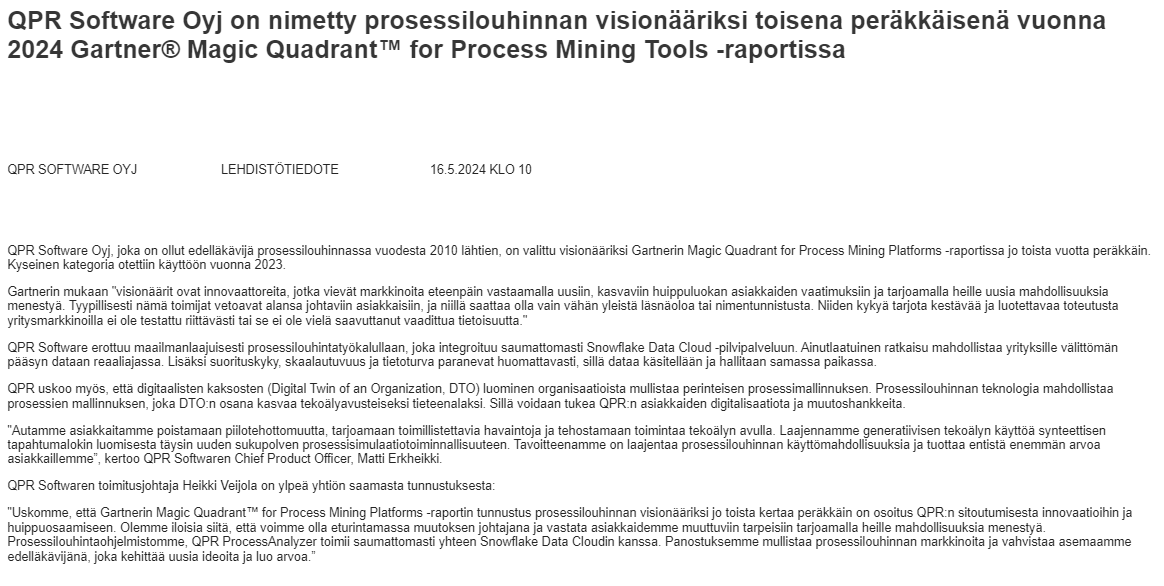 The deal includes QPR’s ProcessAnalyzer software. The size of the deal was not disclosed, but its announcement via a press release suggests a relatively small deal. In any case, successes on the sales front are positive for the company, and especially the buyer replacing a competitor’s product with QPR’s solution serves as an encouraging sign of the competitiveness of the company’s product.