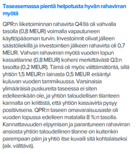 Although QPR’s financial position improved toward the end of last year, the leeway provided by the balance sheet for implementing the growth strategy is limited. Here are the comments regarding the balance sheet from the Q4 update: