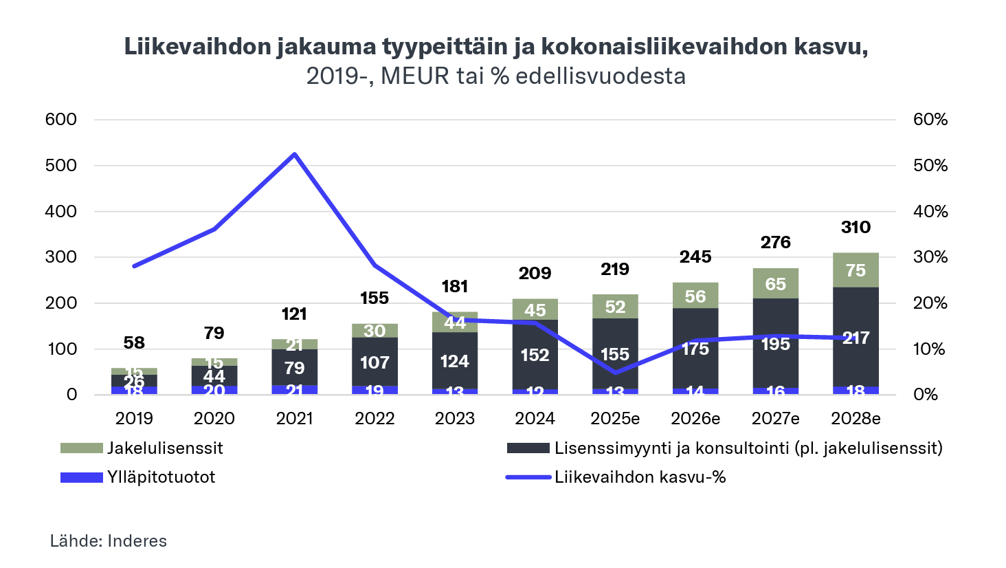 Tässä vuorostaan yhtiön kasvu-% ja ennusteita lähivuosille tuoreesta rapsasta. Tutun näköinen kehitys tuossa kokonaisliikevaihdon nopeutta kuvaavassa sinisessä viivassa.