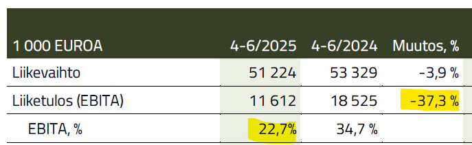 Mainittava myös että Varelius ei kuulemma ole edes miettinyt kulujen/investointien leikkaamista jos myynti ei lähde lentoon loppuvuonna, luotto on kova että kasvua kyllä tulee tulevina vuosina. Tämä tietty tuo painetta katteisiin myös tulevina kvartteina jos myynnin alakulo jatkuu.