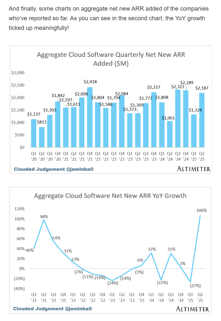 Toisekseen, teknosijoitusfirma Altimeterin kaveri päivitti Q2 osarit raportoineiden Jenkki-Saassien luvut. Saassit saaneet myyntiä kasvatettua reilusti enemmän kuin Q1:llä ja lisämyynnin YoY-kasvu yli 100%, “this is one of the better software earnings seasons we’ve seen in the last few years!”