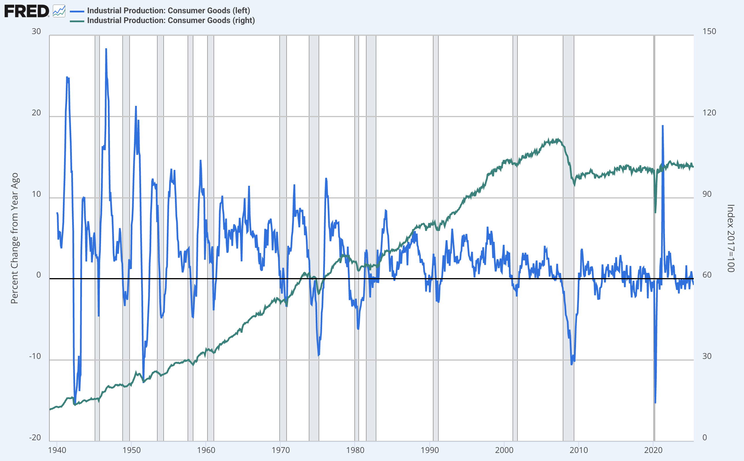 Tässä on esimerkiksi Yhdysvaltain teollisuustuotannon indeksi (vihreä viiva) kuluttajatuotteiden osalta ja sen vuosikasvu (sininen). Kasvu käytännössä pysähtyi finanssikriisin jälkeen, ja koronassa käytiin pikakyykyssä ja sitä seuranneessa rajussa elpymisessä mikä muuttui nopeasti vanhaksi mörninnäksi.
