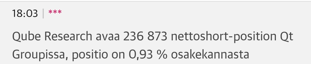 Kauppalehden mukaan Qt oli heinäkuun lopulla Helsingin kolmanneksi shortatuin osake. Tämän jälkeen kuten @TomiP totesi yksi toimija vielä kasvatti positiotaan, nyt 2.8% osakkeista shortattuna (pienemmät shorttipositiot huomioivan Equilendin mukaan vajaa 5%).