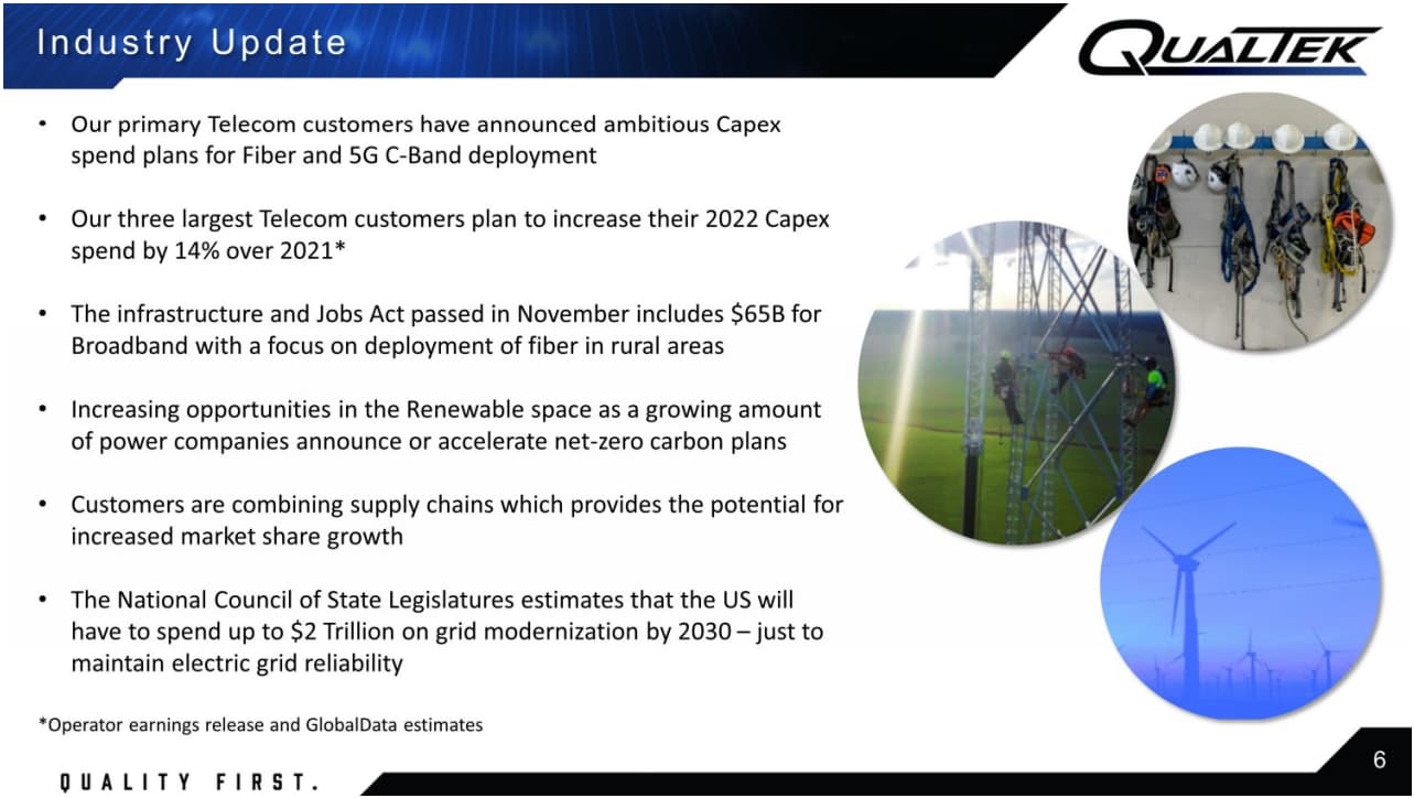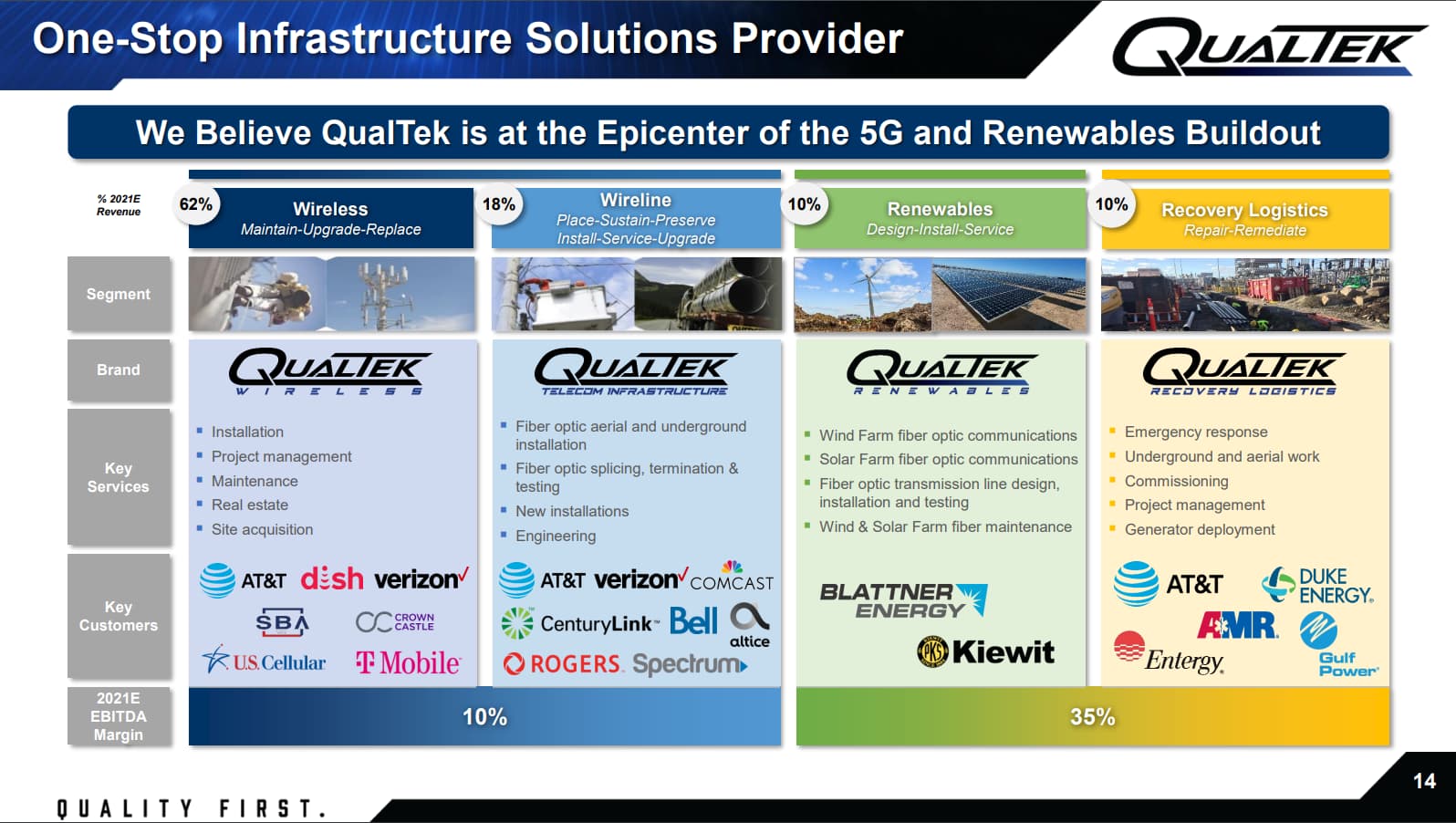 QualTek Services Inc ($QTEK) on US markkinalle fokusoitunut infran rakentaja. Kohteena erityisesti langattomat verkot, mastot, 5G tukiasemat jne. Toinen merkittävä osa on kuituverkkojen asennukset. Pienempiä, mutta nopeammin kasvavia uusiutuvan energian infran rakentaminen sekä poikkeustilojen logistiikka, uutena myös radioverkkojen konsultointi.