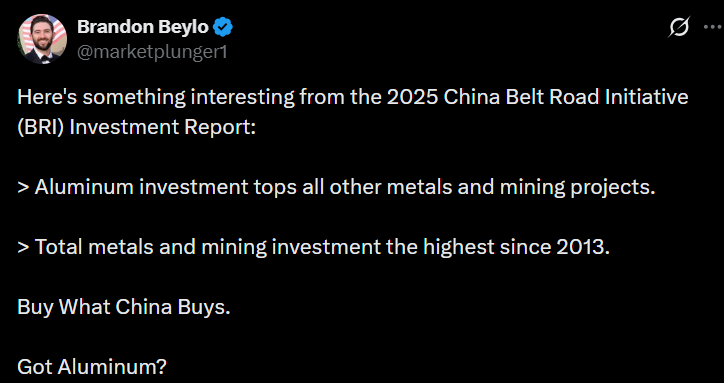 The message of the tweet for investors is quite clear: follow China’s cash flows, which are going specifically into things like aluminum. I’ve never really looked into aluminum-related things from an investment perspective before.