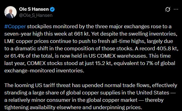One price driver has been Trump’s tariff threats. To avoid tariffs, Americans are currently hoarding copper in a big way, and inventory levels there are at an all-time high.