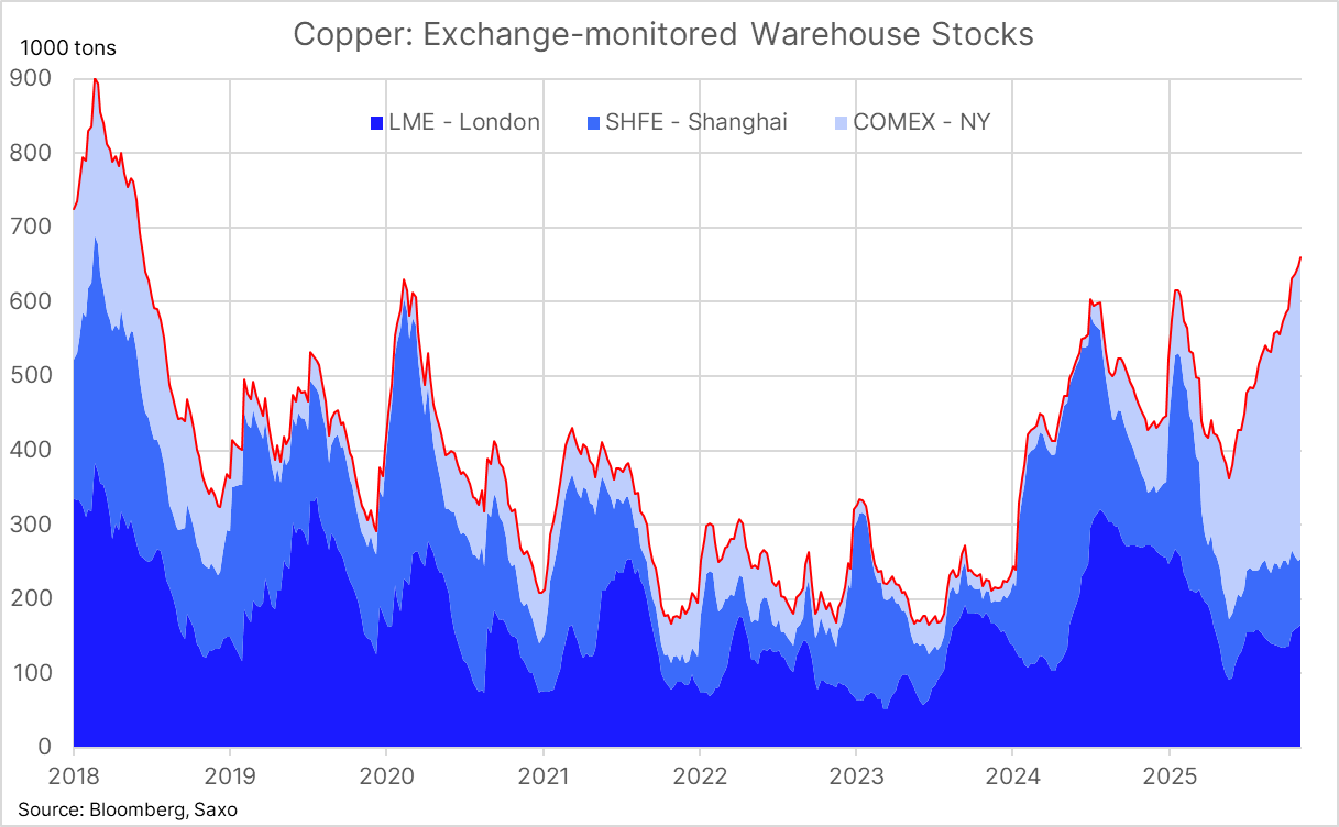 Copper inventories on exchanges are at a seven-year high and prices continue to rise.