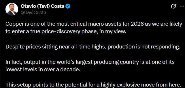 Copper prices are near all-time highs, but the production side is modest. The tweet notes that production in the world’s largest producing country is among the lowest in over a decade, and it speculates on a potential rocket-like rise for copper next year.
