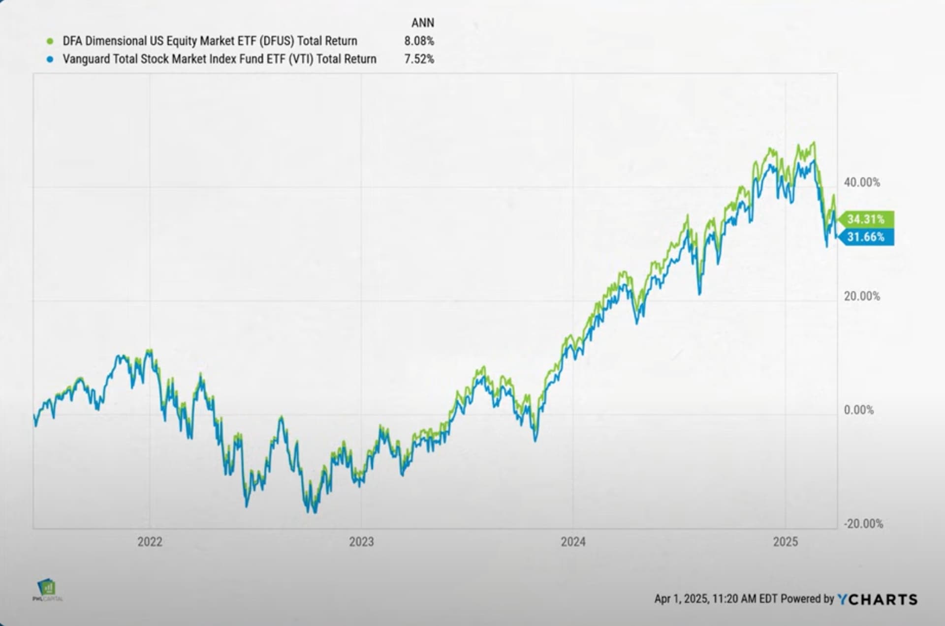 Lopussa esimerkiksi nostettiin DFA:n DFUS, joka pyrkii tavoittelemaan jenkkimarkkinan tuottoa joustavammalla indeksöimättömällä ratkaisulla olematta kuitenkaan faktori-ETF. DFUS on kuluiltaan vain hieman vastaavaa indeksiä seuraavaa ETF:ää VTI:tä kalliimpi 0,09% vs 0,03%, ja on lyhyen historiansa aikana peitonnut sen 0,56% annualisoituna.