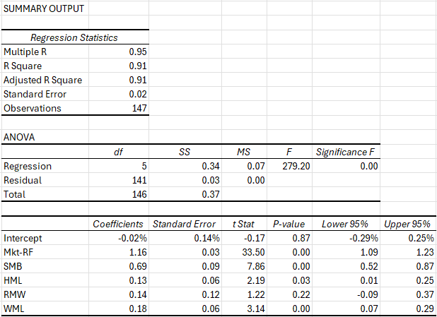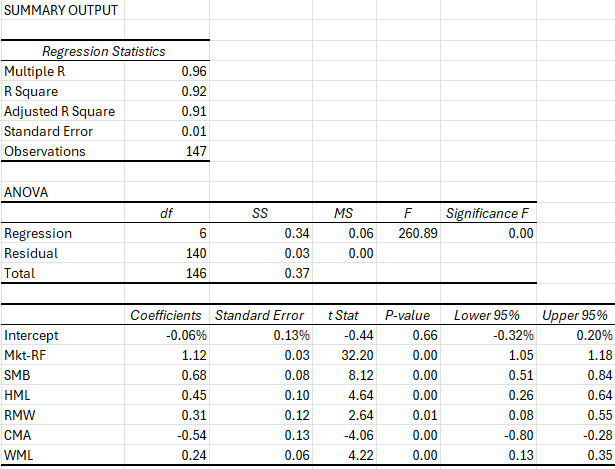 The fund’s factor exposure is strong across the board, though strong negative exposure to the investments premium (i.e., CMA), which is directly targeted, does offset some (but not all) of the strong exposure to the value- and profitability premia (i.e., HML and RMW respectively). The regression results that exclude CMA paint a more conservative picture. In fact, the fund’s factor exposure lines up very closely with that of the MSCI World Small Cap Diversified Multiple-Factor index, which as of yet is not tracked by any fund.