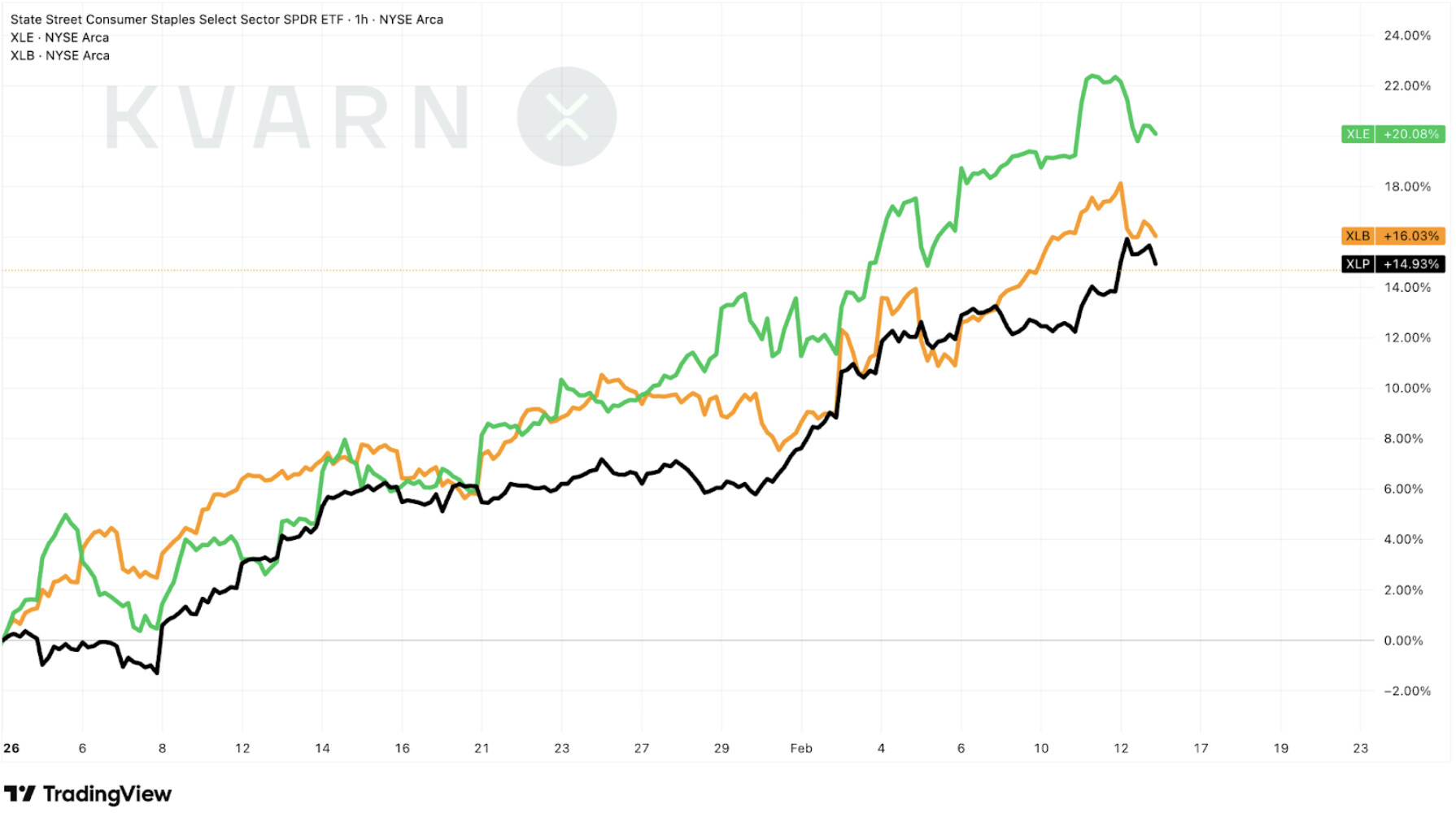 Consumer Staples (XLP), the Materials sector (XLB), and the Energy sector (XLE) have all seen sharp rallies in recent months.