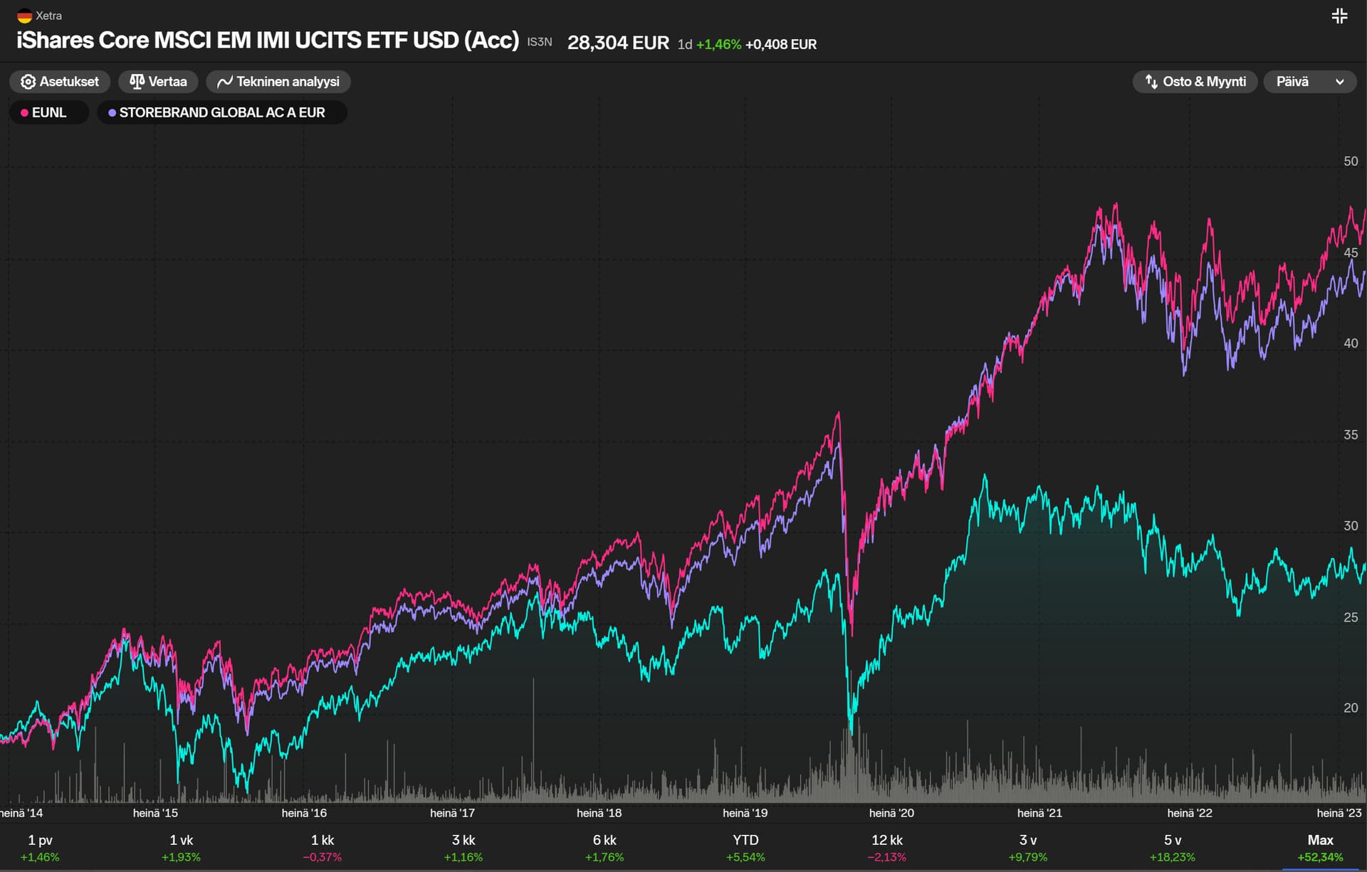 Itse pohdin tämän siten, että “eunl” + “is3n” -ETF-kombossa kulut vajaa ~0,2 % ja tuossa Storebrand Globalissa kulut 0,31 %, joten jos ETF:n kaupankäyntikulut (kaikki ostot ja myynti) ovat pienemmät kuin 0,11 % yhtä omistamisvuotta kohden, on ETF parempi vaihtoehto.