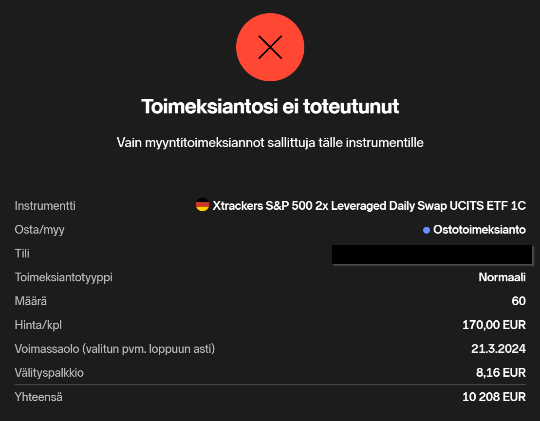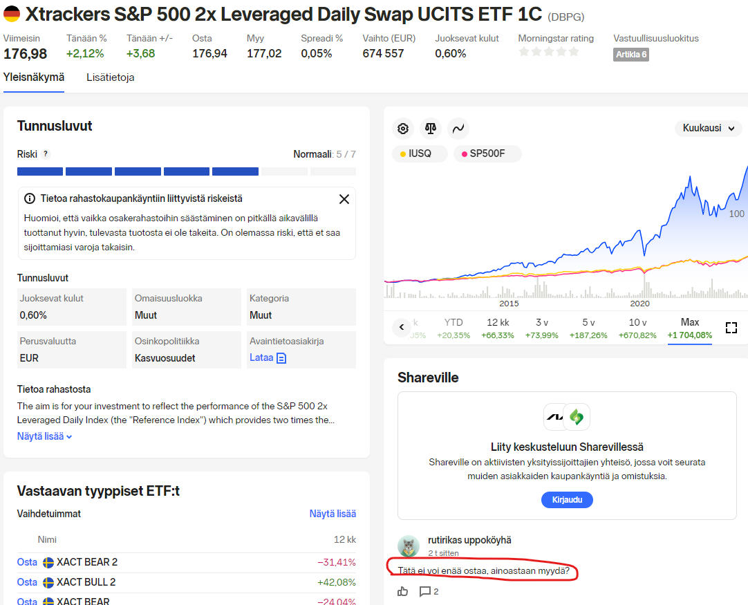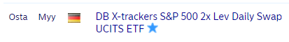 Tätä Xtracker 2x S&P 500:sta pystyy ostamaan Nordean kautta, vaikka Nordnetissa ei pystykkään. En tiedä sitten millä perusteella Nordnet estää ostaminen.