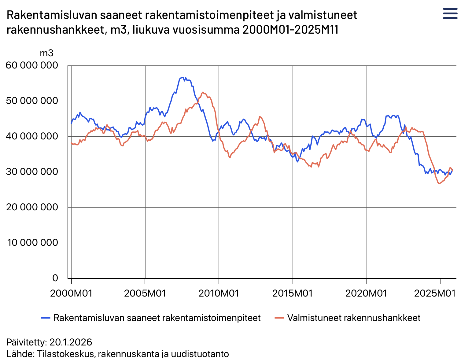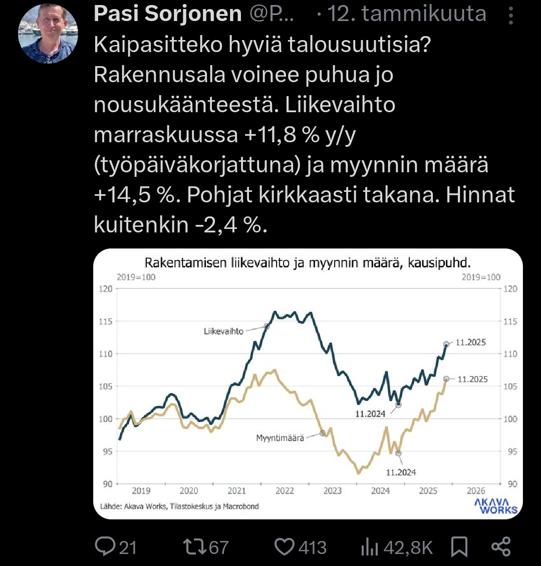 And what is the basis for the claim that these infrastructure construction activities have increased so much during 2025 compared to previous infrastructure construction that they alone have pulled the entire construction industry back into an upswing that isn’t visible in the cubic volume statistics? Instead of shouting from the sidelines, why don’t you post some statistics supporting the claim about this massive increase in infrastructure construction. The projects Jukka listed were also in my message under the title “individual strategic projects,” and while they are large construction projects by Finnish standards, they are still only a minor addition compared to the construction required annually for the maintenance and replacement of the entire current infrastructure base.