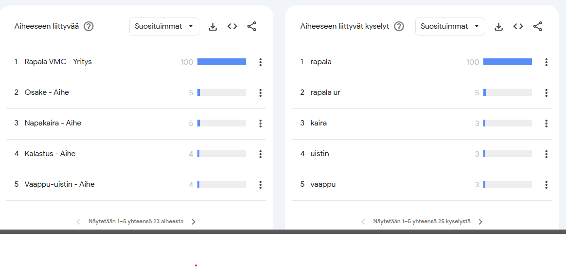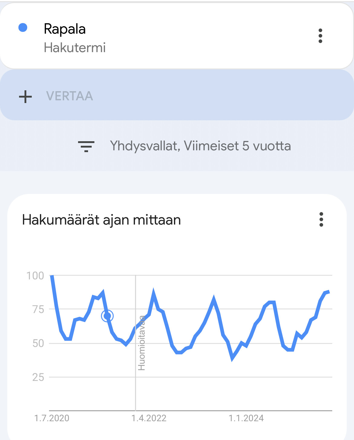 Rapalan kohdalla CrusCity-mallisto tukee varmasti näkyvyyttä, mutta olen joissain kuluttajatuoteyhtiöissä ihmetellyt hakutulosten kasvua. Sitten huomasin Chris Camillon twiittiketjun googlen hakutuloksiin liittyen. Hänen teoriansa on että tekoäly ajaa joidenkin brändien/tuotteiden hakutulosten vahvaa kehitystä ja vääristää sen myötä Google Trendsin luomaa kokonaiskuvaa.