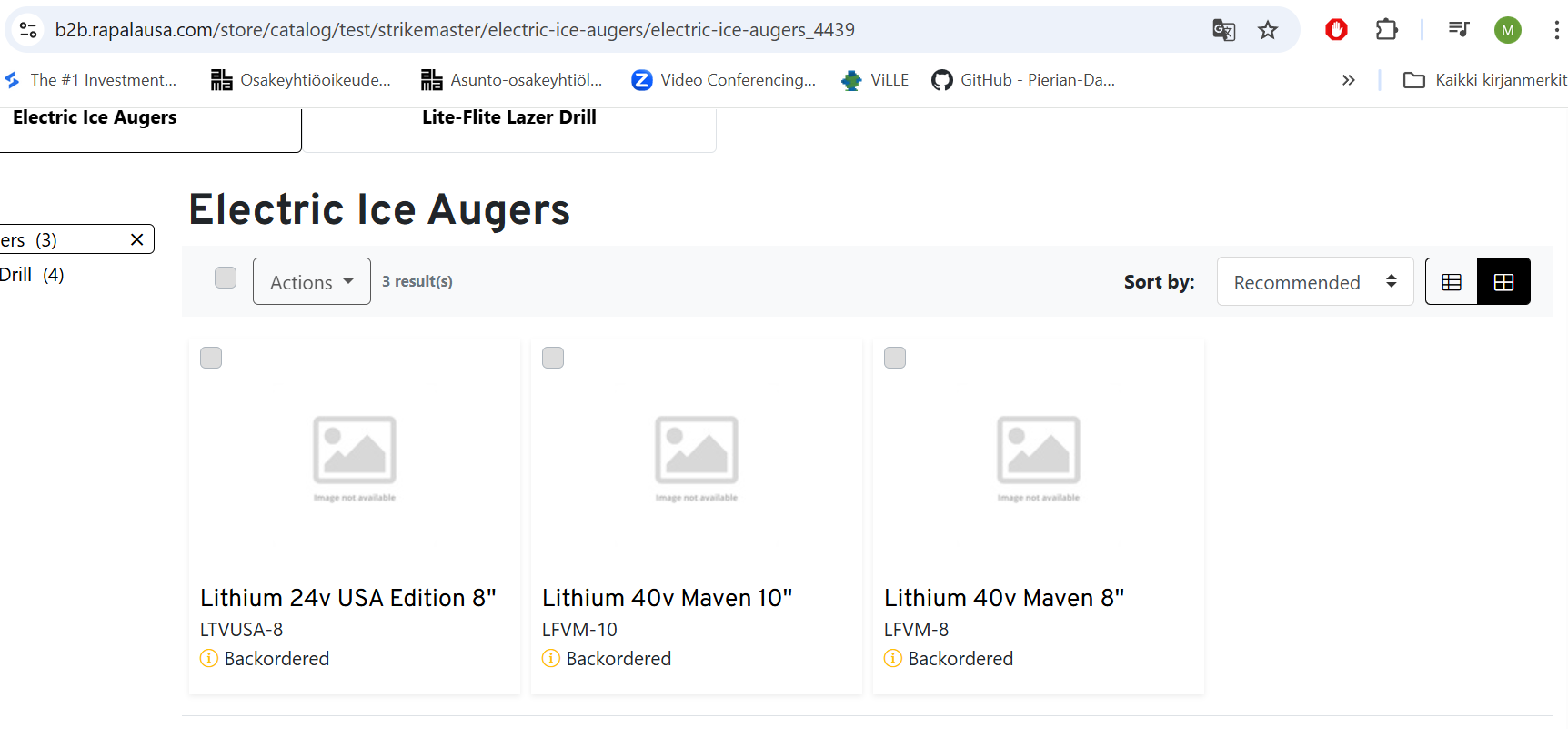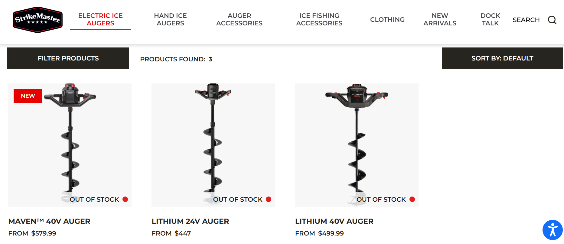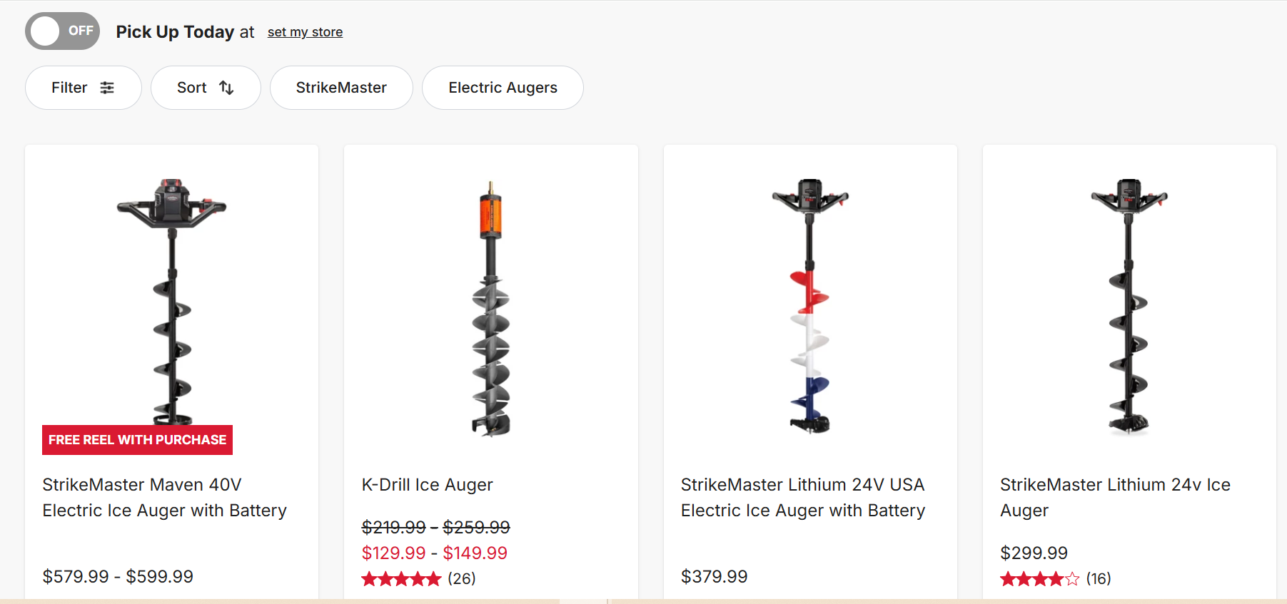 ICAST 2025 Ice Fishing-kategorian voittaja tuotteet, eli StrikeMasterin Maven 40V sähkökairat on viime kuun lopulla/tässä kuussa saatu Usan markkinoille. Esimerkiksi Scheel nimisellä jälleenmyyjällä, jolla on USAssa 34 myyntipistettä kaira on ensimmäisenä listalla, kun kairat järjestetään suosituimman mukaan. Kuvankaappaus alla: