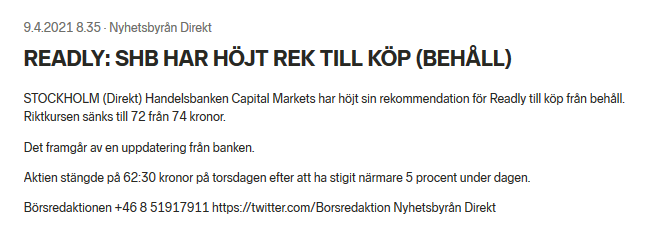 Tämä tarkoittaa noin 165 miljoonan kruunun kokonaismyyntituottoa. Hinta vastaa 13 prosentin alennusta verrattuna Readlyn osakkeen tiistain päätöskurssiin, joka oli 62,95 kruunua.