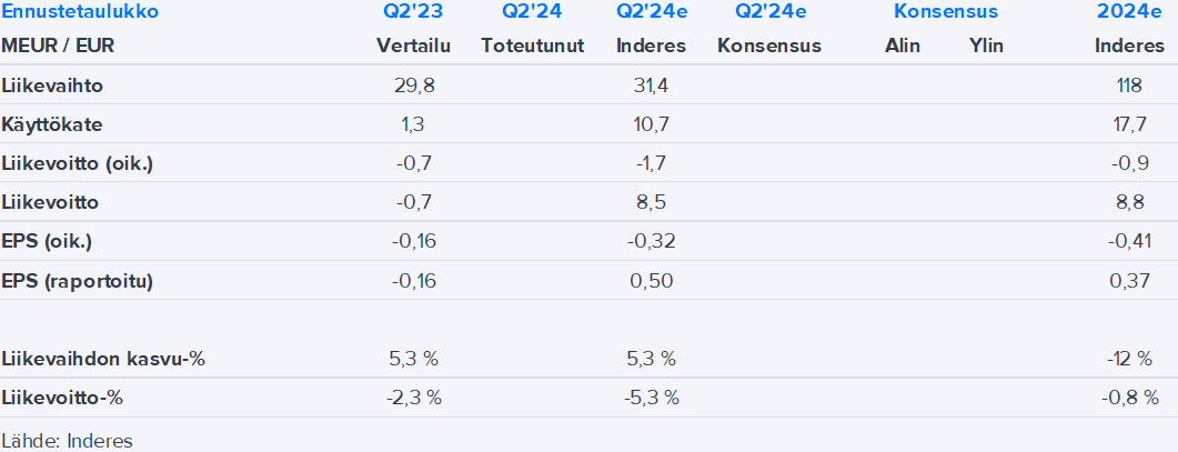 -Yhtiön liiketulos oli 0,3 miljoonaa euroa, kun se vuosi sitten samaisella ajanjaksolla oli 0,9 miljoonaa euroa tappiolla. Yhtiötä seuraava Inderes odotti yhtiön liikevoiton olevan -1,7 miljoona (kauppalehdestä lainattua)