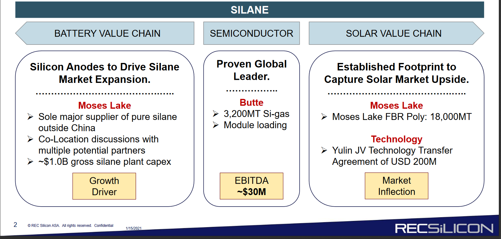 Piianodit grafiittianodien korvaajina voivat parantaa nykyisten litiumioniakkujen energiatiheyttä 50 %, mikä vähentää tarvittavia materiaaleja ja valmistusaikaa, ja siten kustannuksia. USD/kWh-kustannusten minimointi on lyhin tie sähköajoneuvojen kilpailukyvyn parantamiseen ja on myös avain ruudukon stabilointiin liittyvän valtavan markkinapotentiaalin avaamiseen, mikä teoreettisesti edustaa yhtä suurta markkinamahdollisuutta. Yli 30 yritystä työskentelee turpoamisongelman lieventämiseksi/ratkaisemiseksi, mukaan lukien esimerkiksi Group 14. Näiden yritysten osoittama edistys ja pääsy pääomaan (esim. Sila Nanon äskettäinen 590 miljoonan dollarin osakeanti 3,3 miljardin dollarin arvostuksella) tekevät meistä optimistisempia kaupallistumisen todennäköisyyden suhteen. Turpoamisongelman ratkaisemiseksi ymmärryksemme mukaan vaadittu piin puhtauden/konsistenssin standardi voidaan saavuttaa vain silaani-kaasun avulla, jonka hallitseva tuottaja REC on (Butte noin 70 %:n nykyisellä markkinaosuudella ja Moses Lake 25 000 tonnin käyttämättömällä kapasiteetilla). Kaupallistumisskenaariossa ei ole haastavaa kuvitella, että REC:n koko silaanikapasiteetti ohjataan akkuteollisuuteen – itse asiassa sen silaani-osaaminen voisi olla merkityksellistä seuraavan sukupolven kapasiteetin laajennuksissa.