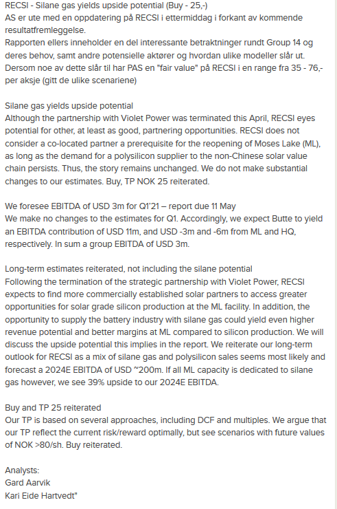 Välitystalo päättelee, että REC voisi saavuttaa 319 miljoonan dollarin käyttökatteen (EBITDA) silaanikaasun hinnalla 22 dollaria kilolta, ja että tämä tarkoittaa REC-osakkeen olevan todennäköisesti yli 50 kruunun arvoinen osakkeelta, jos silaaniin perustuvista anodeista tulee standardi autoteollisuudessa.