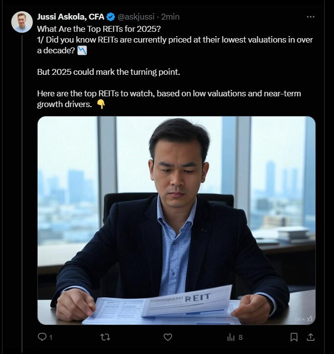 I buy when it looks cheap through key figures It’s worth checking out the AFFO / FFO considerations as valuation multiples from this thread. REITs are quite a popular asset class in the US, and especially for popular ones, you can find good analysis, e.g., on Seeking Alpha, which covers historical valuation multiples / peer comparisons. I’m particularly interested in WPC and ARE at current prices