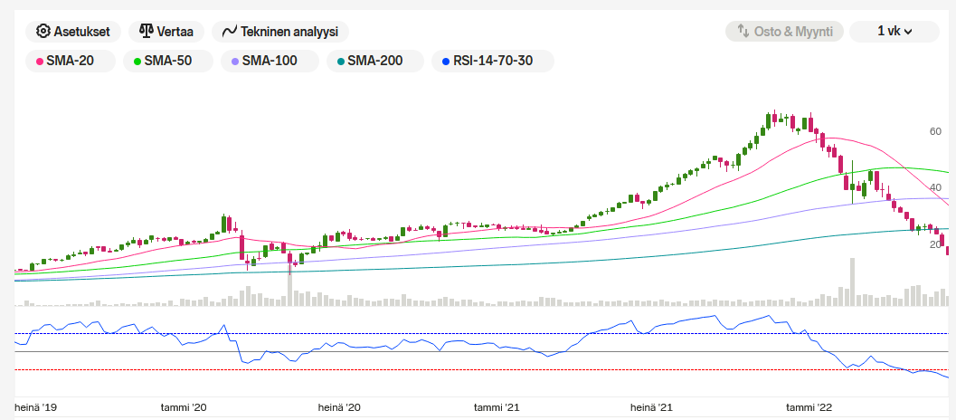 Jos katselee viikkotason RSI, niin huomaa että tämä myyntiaalto on nyt ollut äärettömän raju. mennään kohta alle RSI 20 ja tuon lähelle ei edes päästy viikkotasolla pahimmassa koronamontussa.
