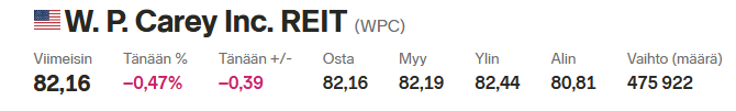 Edit: Ja siitä laadusta puheenollen, WPC juuri ilmoitti osingon korotuksesta. Toki täysin symbolinen 0,2 %, mutta viestinee myös yhtiön uskosta omaan toimintaansa myös tulevina aikoina. https://www.prnewswire.com/news-releases/w-p-carey-inc-increases-quarterly-dividend-to-1-059-per-share-301569939.html