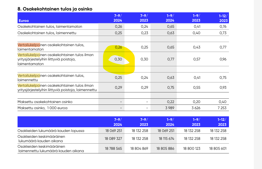 Riippuu mitä vertailukelpoista EPS käyttää, mutta tuossa meillä on vertailukelpoinen EPS ilman yritysostojen poistoja, joka oli tuon 0,30. Ohessa kuva Relaisin julkaisusta