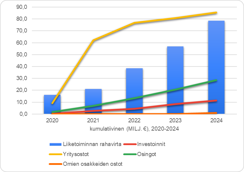 Tarkastelujaksolla (2020-2024) yritysostoihin on sijoitettu kumulatiivisesti 85,5 milj. € ja samalla osinkoa on kuitenkin maksettu melkein 28,5 milj. €. Liiketoiminnan rahavirtaa vastaavalta ajanjaksolta on jauhettu vain 78,5 milj. €, joten lisää pääomaa on todella tarvittu velan muodossa. Investointeihin on puolestaan sijoitettu 11,4 milj. € ja omien ostoja testattiin sillä yhdellä miljoonalla jokin aika sitten.