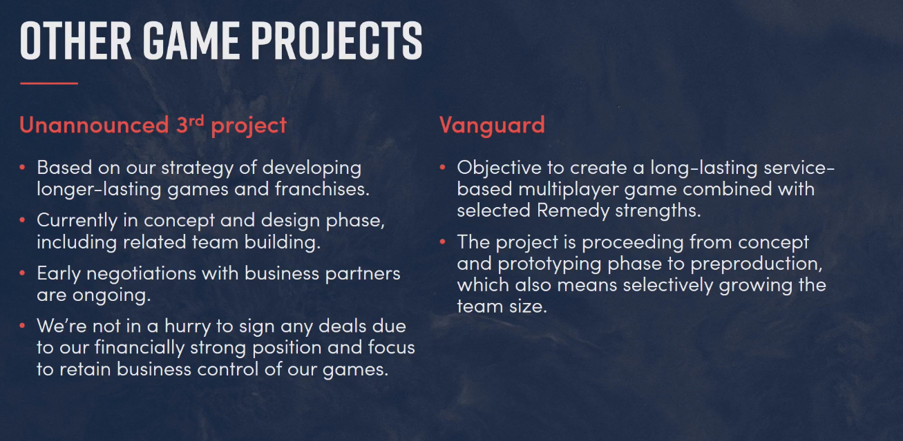 2 471 tuhannen euron positiivinen vaikutus liikevoittoon kertaluontoisesta kirjauksesta, joka koostui aiemmin julkaistujen pelien takautuvasti maksetuista rojalteista. Tähän liittyen Alan Wake -pelien julkaisuoikeudet palautuivat Remedylle.