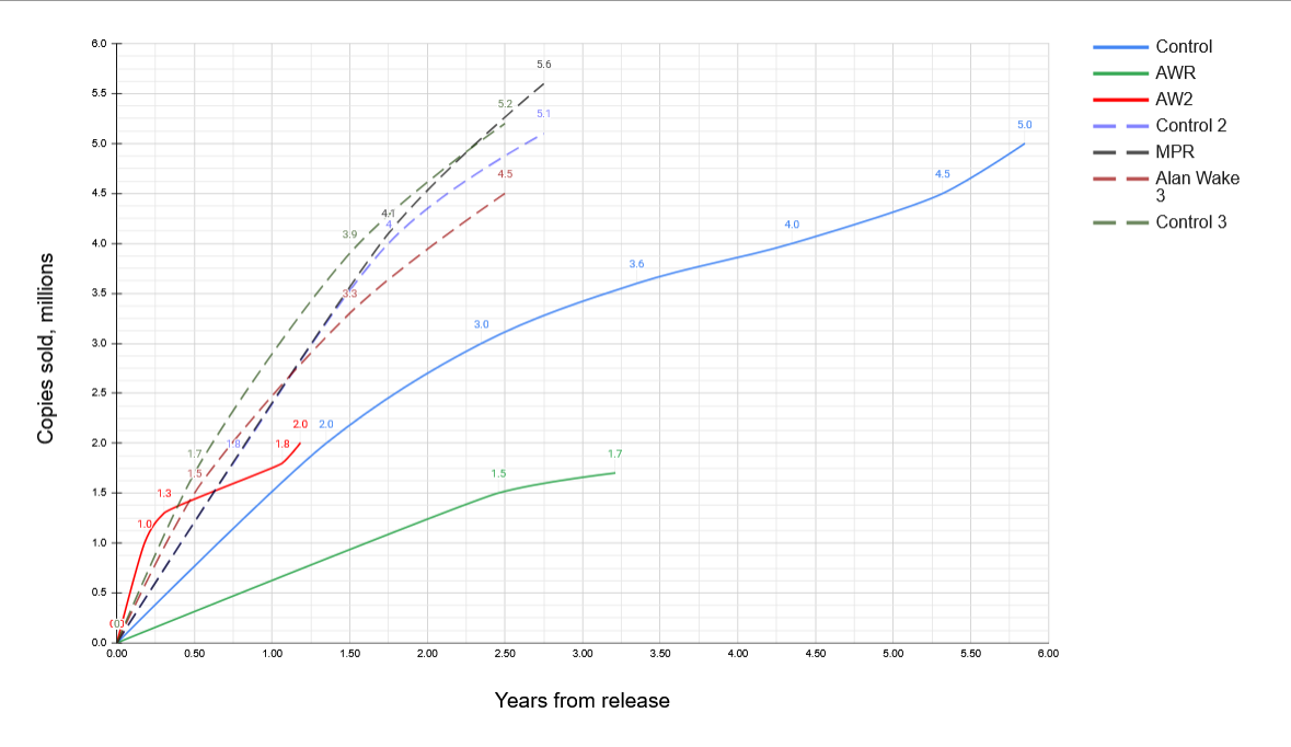 Toisin sanoen odotuksena on, että kaikki tulevat AAA-pelit (pl. MPR) tulevat myymään karkeasti samaa tahtia tai hieman hitaammin kuin Alan Wake 2. Kun suhteutetaan kauppapaikkarajoitukset (EGS, fyysisten puuttuminen), niin tulevilta peleiltä odotetaan merkittävästi heikompaa myyntimenestystä kuin Alan Wake 2:lle.