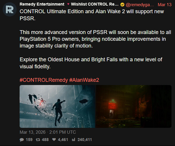 Sonyn omaan PSSR upscalerin seuraava päviitetty versio tulee niin Control: Ultimate Editioniin kuin Alan Wake 2 (AMD:n rauta, Sonyn softa)
