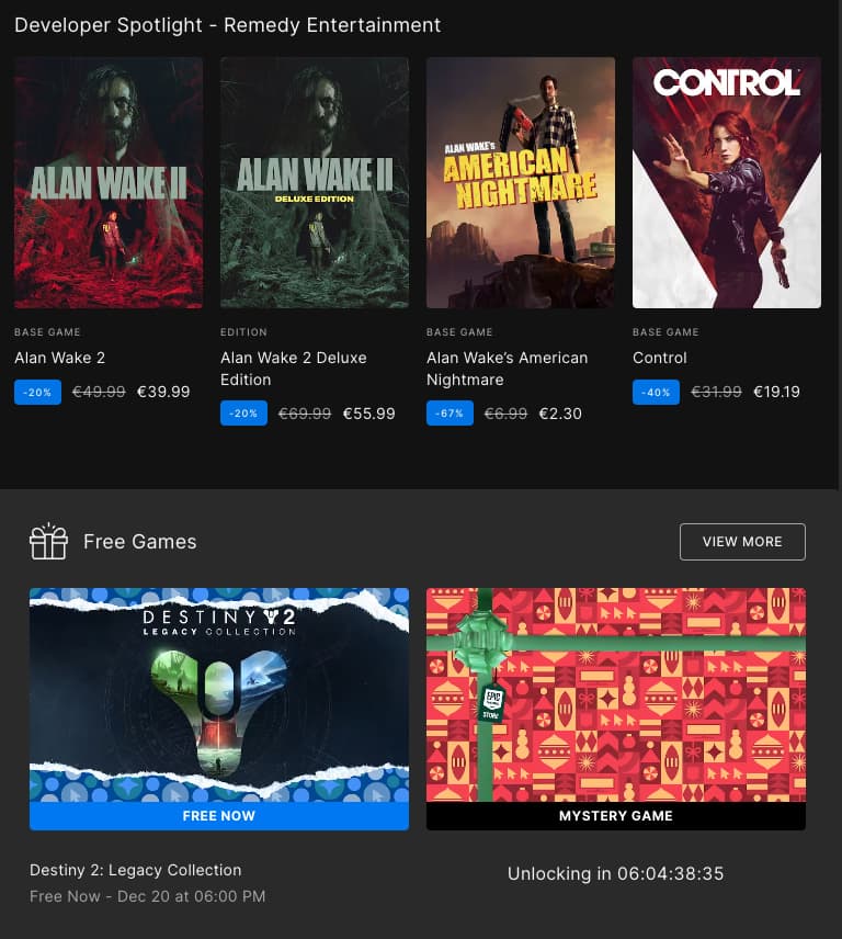 Epic kyllä puskee Remedya hyvin kauppapaikassaan. Remedy developer spotlight kauppapaikkaan liikennettä tuovien ilmaispelien yläpuolella EGS:n etusivulla.