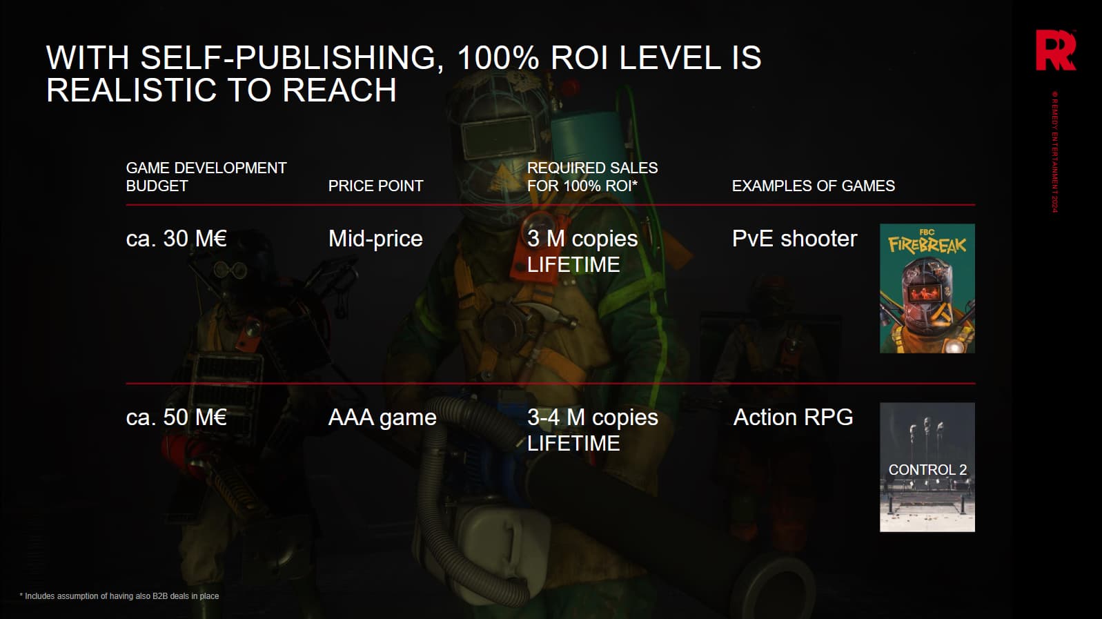 Yllä oleva auttaa ehkä hahmottamaan Remedyn minimitavoitetta (100% ROI) Firebreakin osalta. Tavoitteen saavuttaminen tarkoittaisi Remedyn arvioiden mukaan sen 3M myytyä kopiota koko elinkaaren aikana.