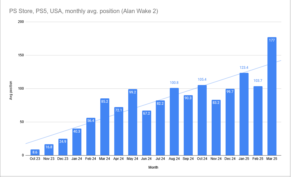 The month is again coming to an end, so below are Alan Wake 2’s average sales ranks for March. Based on the average rankings, the sales pace has clearly slowed down in March.