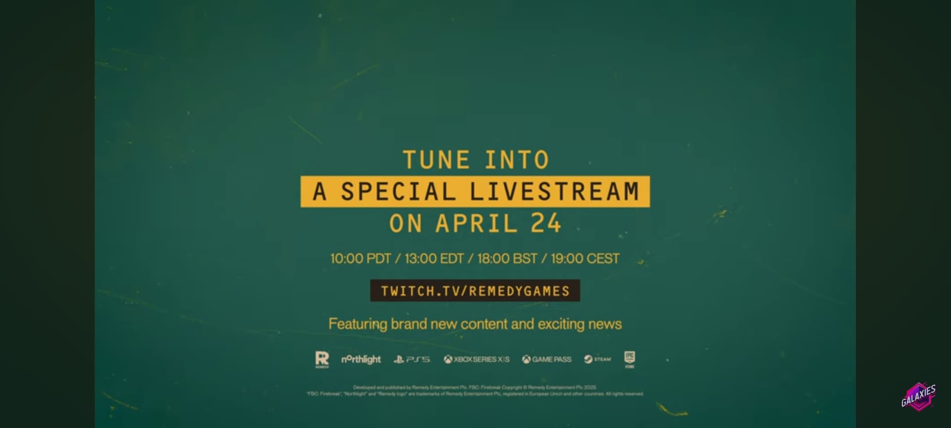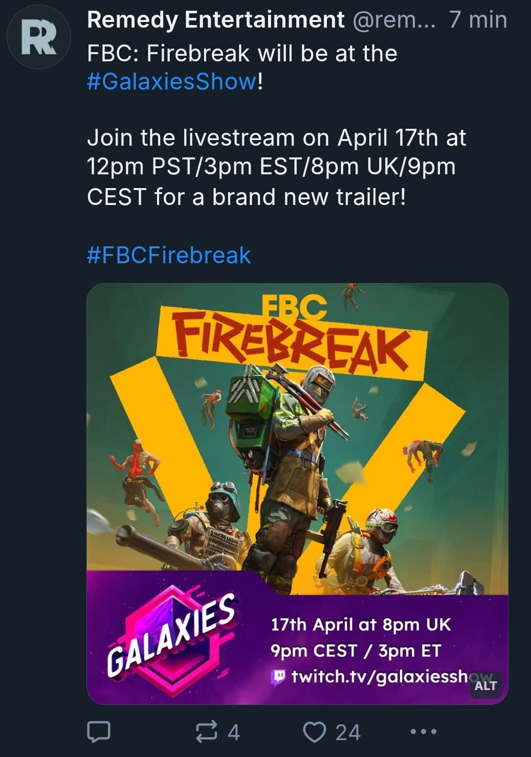 Huomenna kello 22:00 Suomen aikaa alkaen tulee uusi Firebreak-traileri pienehköllä Galaxies Showcase -twitch kanavalla (verkkosivut).