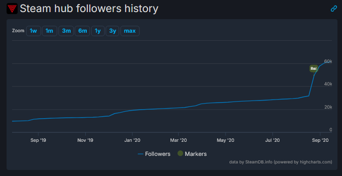 Luonnollisesti seuraajamäärät, wishlistaukset ja ennakkotilausket kasvavat mitä lähemmäksi julkaisua mennään. Usein pelit ottavat suuren loikan seuraajissa, wishlistauksissa ja ennakkotilaajissa juuri ennen pelin julkaisua. Esimerkkinä seuraajatilasto Controlin Steam-versiosta.