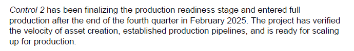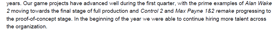 Om man jämför med AW2:s produktionstid på cirka två år, hade jag antagit att Control 2 skulle vara färdigt i slutet av 2026 eller början av 2027. Här bör man särskilt notera att MPR gick i full produktion under Q2–Q3 2024, vilket innebär att Remedy under 2025 har haft två projekt i full produktion. I kommentarerna ovan ser man att Control 2 gick i produktion i ett skede då MPR redan gjort ”utmärkta framsteg i full produktion”. Man bör även beakta att MPR inte är ett helt likadant projekt som Control 2, eftersom man inte behöver skapa nytt på samma sätt, även om MP-spelen förvisso görs om helt från grunden.