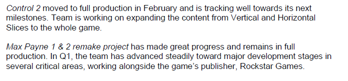 Av den anledningen var mitt antagande att MPR skulle släppas under H1 2026, då det gick i produktion före Control 2. Eftersom alla Max Payne-spel är som mest cirka 10 timmar långa, hade det enligt min mening varit logiskt att MPR-paketet skulle ha varit färdigt betydligt före Control 2. Jag hade personligen lagt till ett halvår av utveckling, så att resurser som frigörs från MPR eventuellt skulle kunna hjälpa till med färdigställandet av Control 2, med en lansering i början av 2027.