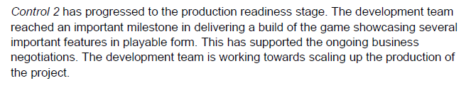 Man kan dra slutsatsen att de långa konceptualiserings-, POC- och “production readiness”-faserna för Control 2 verkligen har hjälpt projektet att gå framåt i produktionsfasen, då spelet släpps ca 1,5 år efter att produktionen startat (osäkert tills vi vet lanseringsdatumet). Samtidigt verkar Remedys förmåga att hantera två parallella eller delvis överlappande produktionsprojekt vara på en åtminstone hygglig nivå. I fortsättningen bör man fundera på om man kan anta att två parallella produktionsfaser inte nödvändigtvis stör varandra på samma sätt som när till exempel AW2 utgjorde ett hinder för andra projekts framfart. Nu när lanseringen av Control 2 närmar sig är det bra att även följa kommentarerna kring MPR och göra en lägesanalys av var alla projekt befinner sig, eftersom det på ett generellt plan ser ut som att Remedy har nått den kritiska punkt där produktionsmodellen börjar sitta.