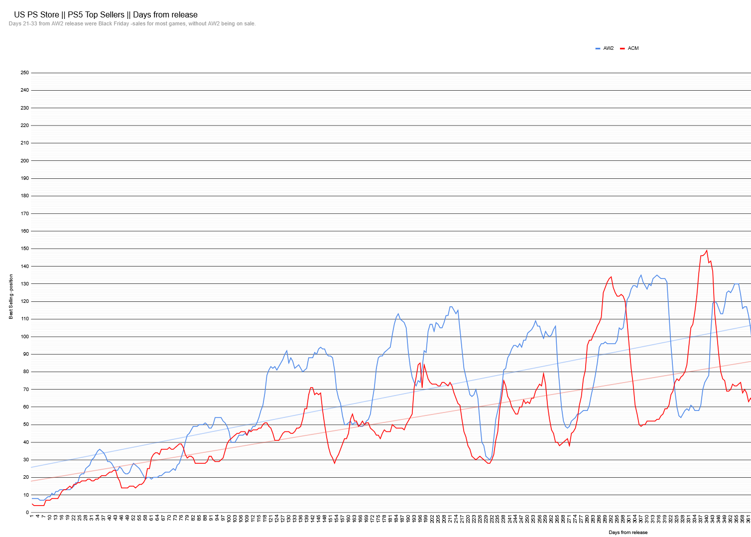 Samma sak sågs redan med AW2, som släpptes inom ett par veckor från AC: Mirage. AW2 hade 89 % på Opencritic och AC: Mirage 76 %. Trots detta sålde AC: Mirage betydligt bättre digitalt på PS5. Och Assassin’s Creed är inte i närheten av Insomniac/Marvel-nivå när det gäller IP-värde. För att inte tala om GTA.