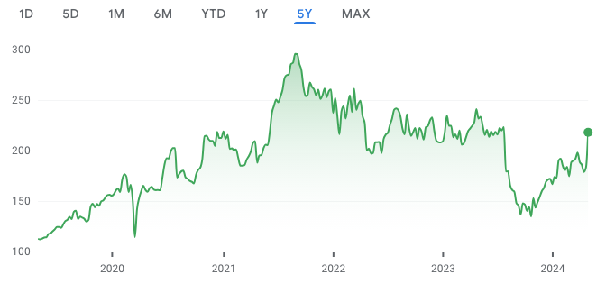 Osake nousi vahvojen tulosten siivittämänä seuraavana päivänä 18,89%. Päätöskurssi oli perjantaina 26.4.2024 218,06 dollaria.