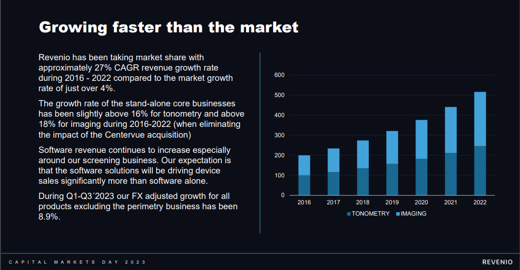 Markkinataloudessa on kuitenkin se hyvä puoli, että lopulta asiakas päättää mikä on hinta/laatu-suhteessa kilpailukykyisin laite tai teknologia - ja siitä olen varma, että iCaren kuvantamislaitteet ovat Centervuen ajoista kasvaneet voimakkaasti markkinaa nopeammin eli voittaneet merkittävästi markkinaosuuksia. Tämä ei perustu vain meidän epävarmoihin mallinnuksiin, vaan toimialatutkimuksiin ja Revenion omiin kommentteihin. Hehän eivät raportoi noita tai anna lukuja, mutta avasivat kuitenkin tämän verran CMD:llä (Imaging).