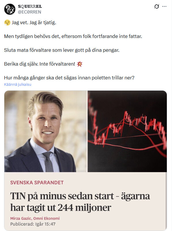 E: tarkennetaan sen verran, että tuo Affärsvärldenin otsikko on hiukan harhaanjohtava. Rahaston perustajat näemmä nostaneet 244 milj. SEK osinkoja, rahastoon sijoittaneet eivät ole lunastaneet sillä summalla.