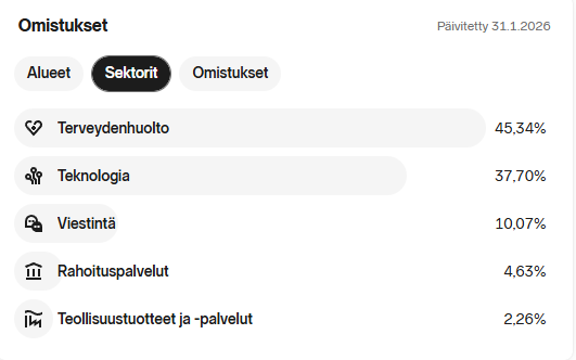Rahastolla onkin merkittävä paino terveydenhuolto sektorille ja se on keskittynyt pohjoismaisiin yhtiöihin.