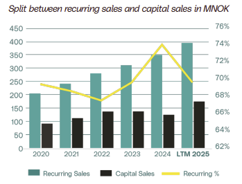 Esimerkiksi Medistim, jota tykkään usein nostaa esille. Yhtiön toistuva liikevaihto nousi noin 74%:iin vuonna 2024, koska laitemyynti oli heikkoa (capital sales). Tämä oli minulle negatiivinen indikaatio, koska laitemyyntihän ajaa tulevaisuuden toistuvaa myyntiä. Vuosi 2025 näyttää huomattavasti paremmalta, vaikka toistuvan liikevaihdon suhteellinen osuus laski kokonaisliikevaihdosta.